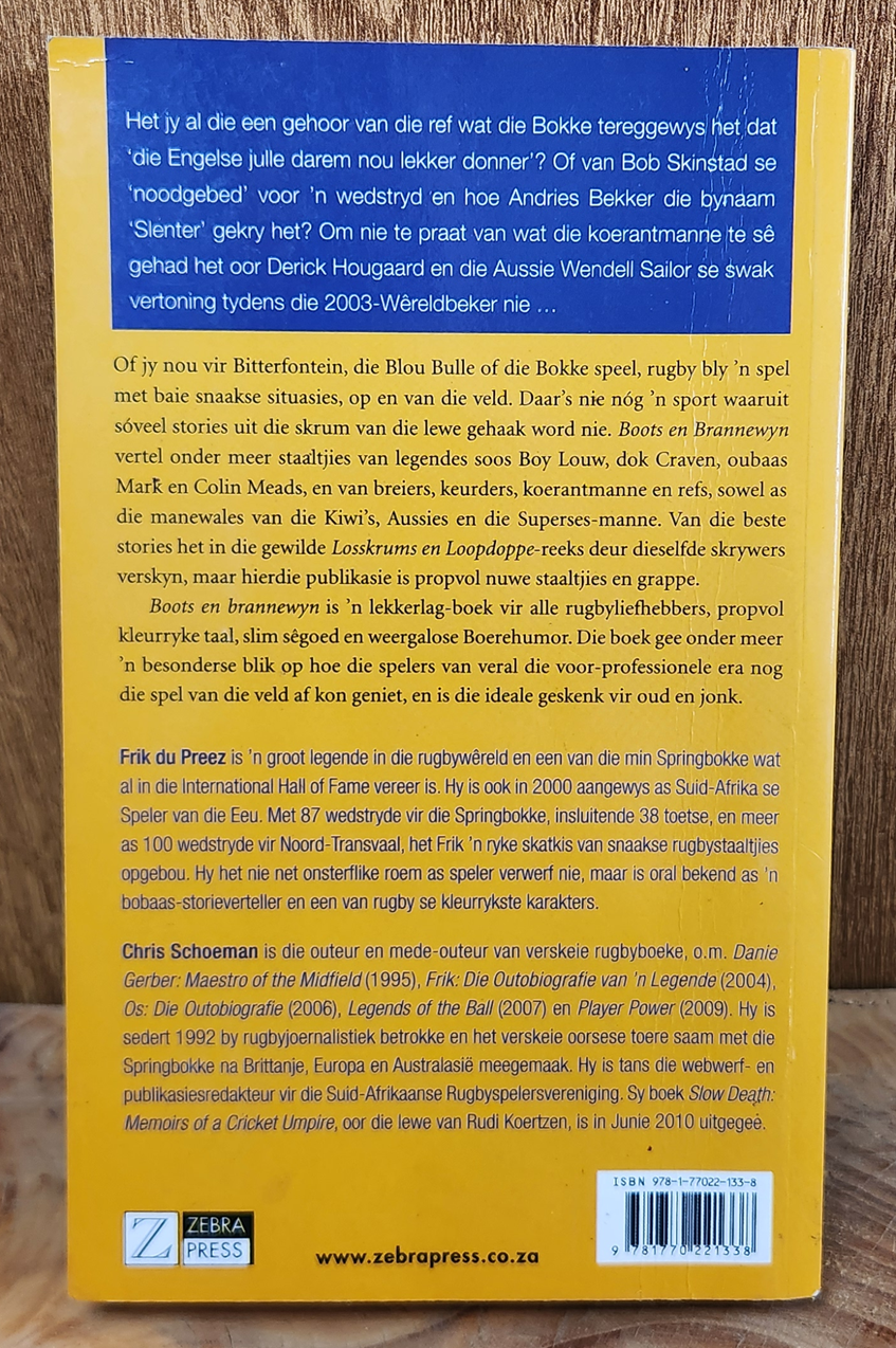 Boots en brannewyn is 'n lekker ontspanboek wat o.a. vertel van Morrie Zimerman se gatvol raak vir hoekskoppies; Ferdie Bergh se helderblou Springbok-kouse; die ref wat die Bokke teregwys dat 'die Engelse julle darem nou lekker donner'; 'n boerbok wat 'n Villagers-man buite aksie stel; en Bob Skinstad se 'noodgebed' voor 'n wedstryd. Daar is ook heelwat staaltjies oor legendes soos Oom Boy Louw, Dok Craven, Oubaas Mark en Colin Meads, oor breiers en refs en die manewales van die Kiwis, Aussies en die Ses Nasies-manne. 'n Lekker-lag boek vir rugby-liefhebbers.