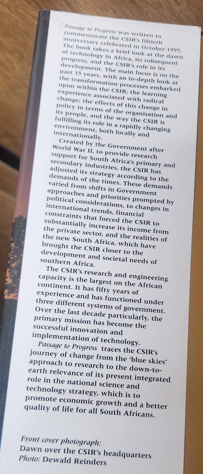 Passage to Progress was written to commemorate the CSIR’s fiftieth anniversary celebrated in October 1995. The book takes a brief look at the dawn of technology in Africa, its subsequent progress, and the CSIR’s role in its development. The main focus is on the past 15 years, with an in-depth look at the transformation processes embarked upon within the CSIR; the learning experience associated with radical change; the effects of this change in policy in terms of the organisation and its people, and the way the CSIR is fulfilling its role in a rapidly changing environment, both locally and internationally.