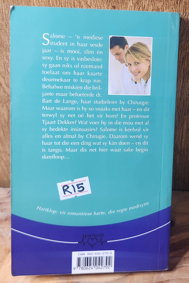 In Tango met 'n chirurg is mediese student Salome keelvol vir alles en almal by Hoekom is die briljante maar befoeterde dr. Bart de Lange, haar studieleier, so snaaks met haar - en dit terwyl sy net oë het vir hom? En professor Tjaart Dekker? Wat voer hy in die mou met al sy bedekte insinuasies? Daarom wend sy haar tot die een ding wat sy kán doen - tango.